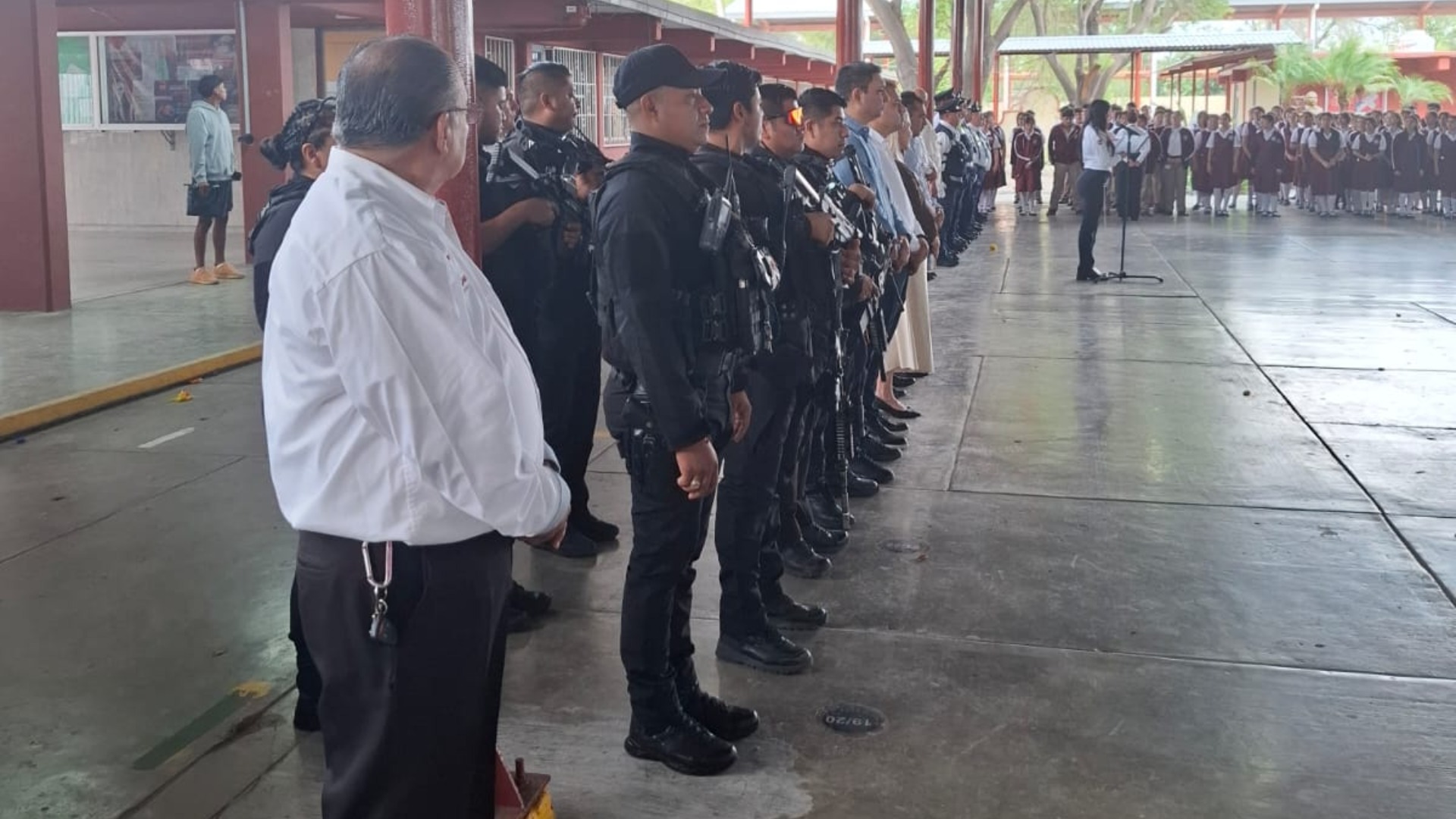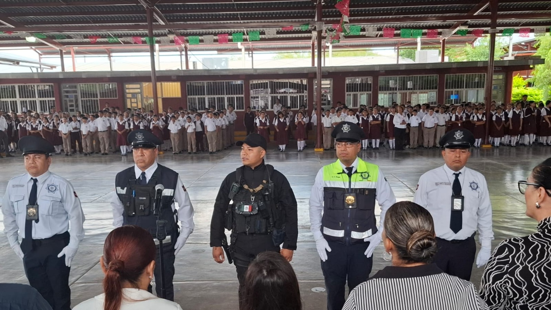 Ceremonia de honores a la bandera y pase de lista a los agentes de vialidad de la Secretaría de Seguridad Pública, con el acompañamiento de regidores del R. Ayuntamiento de Reynosa, promoviendo las campañas Mi amigo el policía, y Condúcete bien.